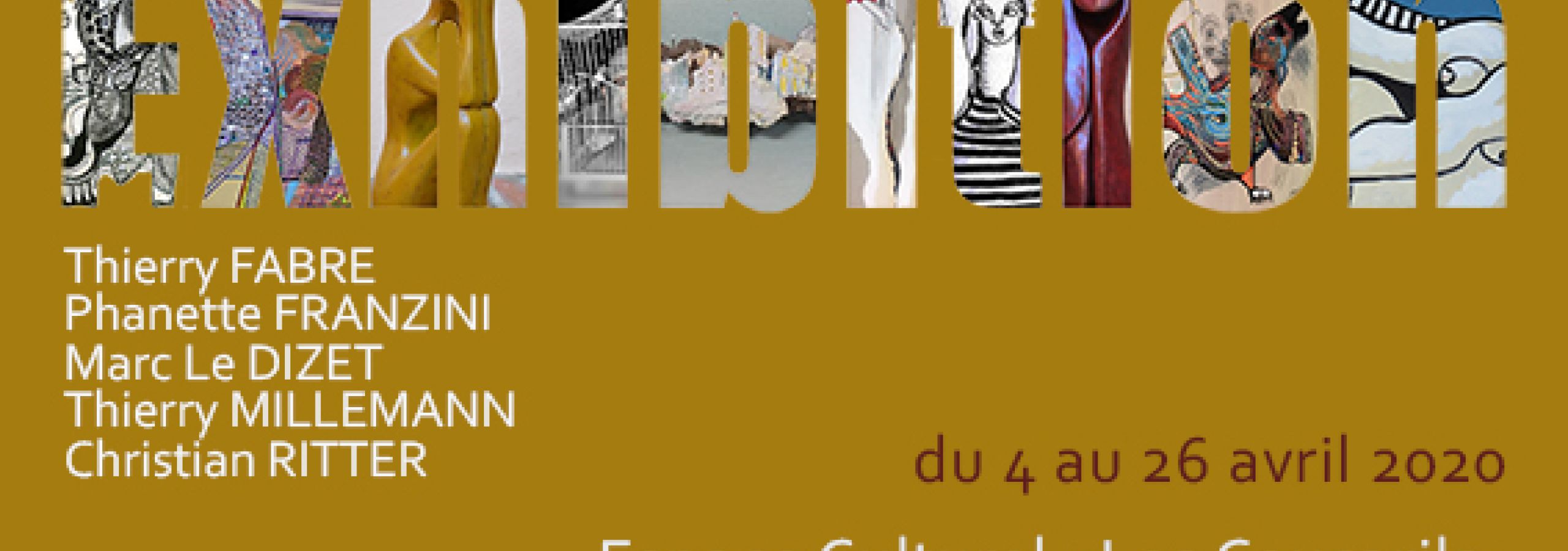 Exposition Exhibition 25 février 2020 Du 4 au 26 Avril "Exhibition" avec Thierry Fabre , Phanette Franzini, Marc le Dizet, Thierry Millemann et Christian Ritter Espace les Coucarils - Carla-BAyle peinture, dessin, sculpture et photo Précédent Suivant