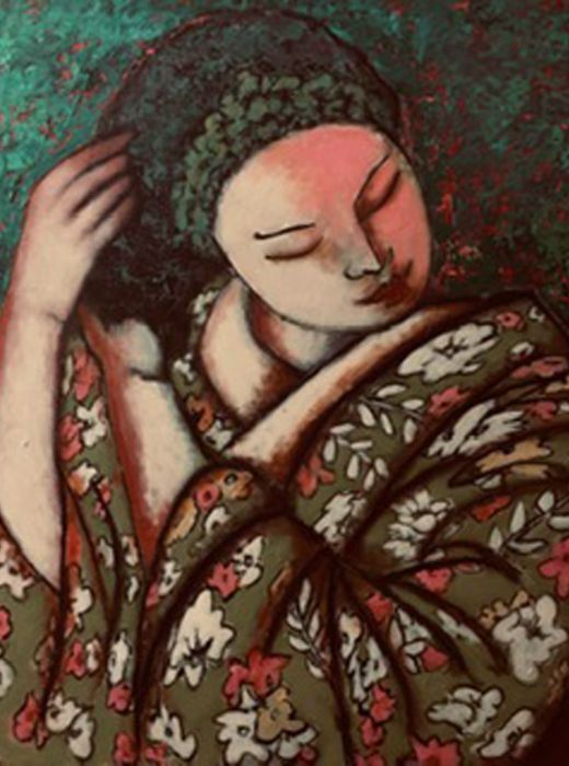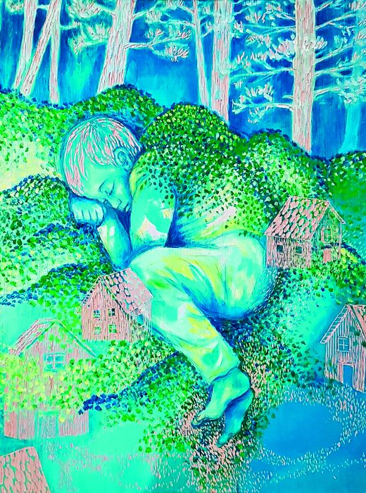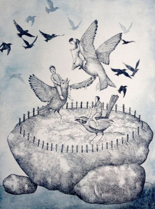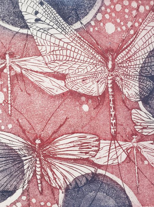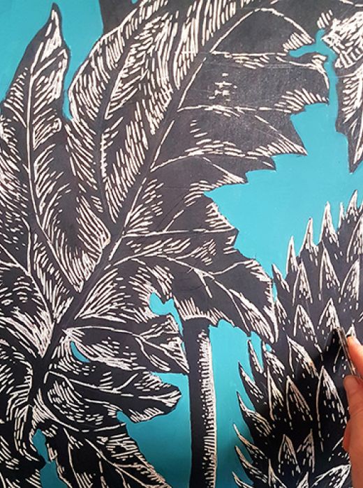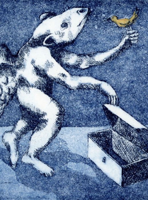 " Plongez dans un univers onirique, et lumineux, souvent peuplé de personnages ou animaux étranges. C'est un travail minutieux qui mêle estampe, bois gravé et peinture."