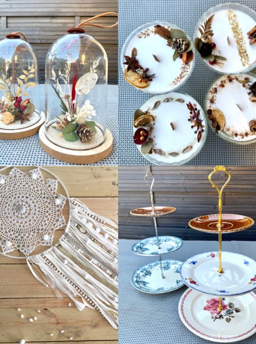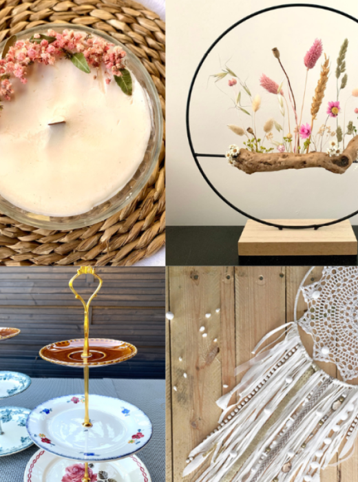 Créations, surcyclages, détournement, et relooking d'objets de décoration. Bougies artisanales, bijoux, compositions fleurs séchées, décorations murales, art de la table, petite brocante...