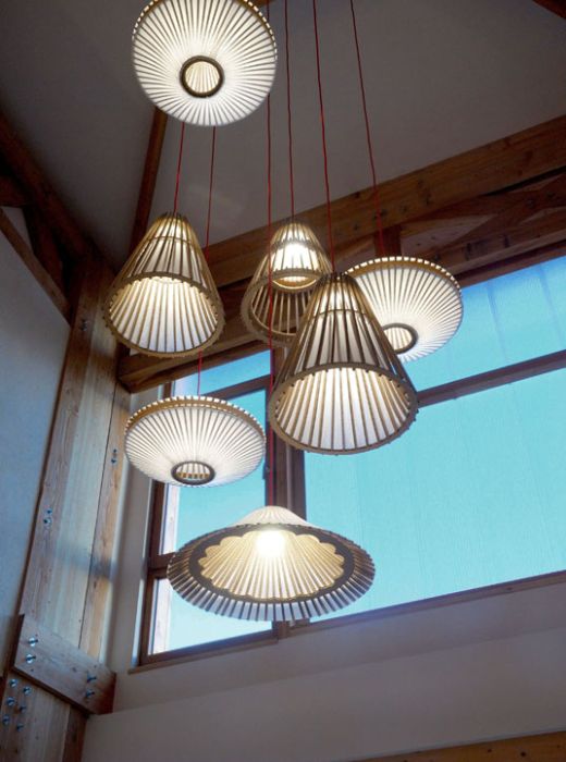 Ces luminaires sont fabriqués à la main, en Ariège. Recherche esthétique et souci écologique se retrouvent dans le choix du matériau utilisé : le carton. Aujourd ‘hui, le carton est omniprésent, c’est un matériau très contemporain. Détourné de son usage habituel, il donne à ces suspensions une dimension poétique ; la lumière filtre à travers ses alvéoles et crée une sensation de légèreté.